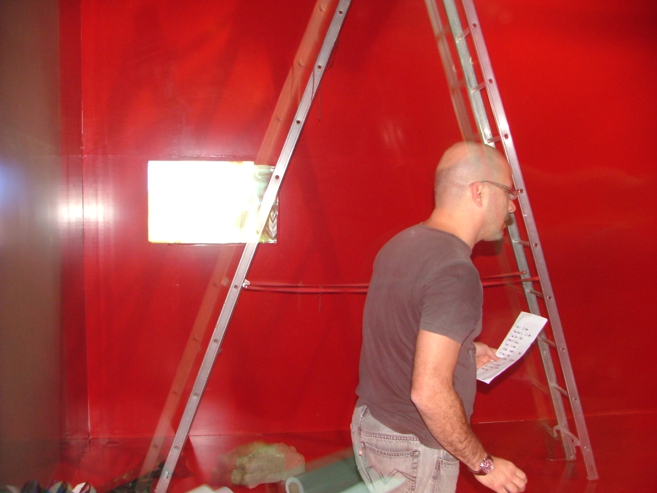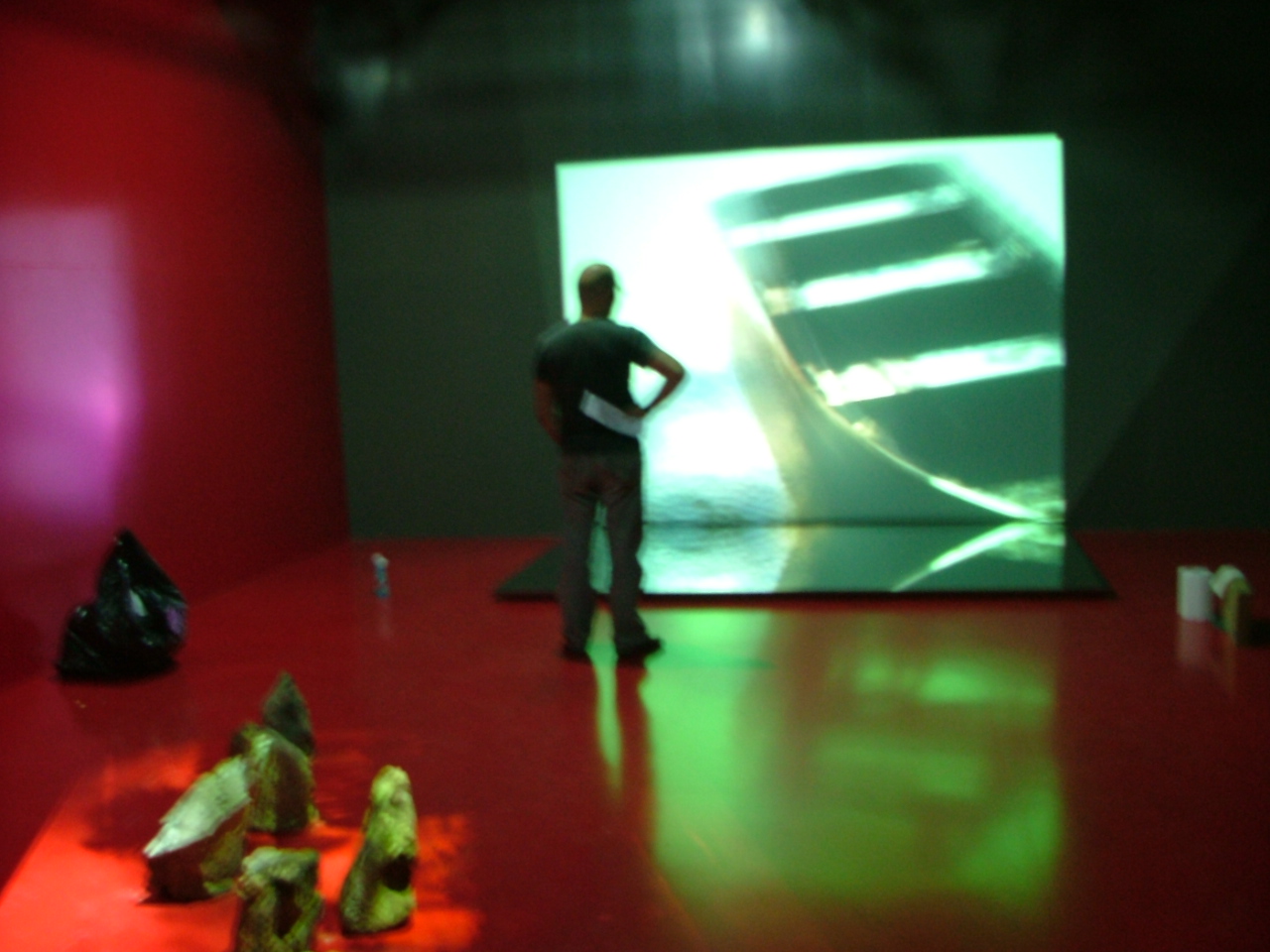 Núcleo principal da obra. Uma tela de 4x4m retroprojetada refletida sobre um espelho com as mesmas dimensões no chão. O espaço todo revestido por vinil preto e vermelho.